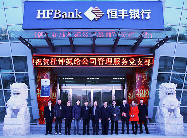 2019年1月16日,杜鐘氨綸公司管理服務黨支部赴恒豐銀行開展黨建結對共建交流活動。此次共建活動由公司總經(jīng)理張斌、副書記王克平帶隊,恒豐銀行行長劉偉陪同。