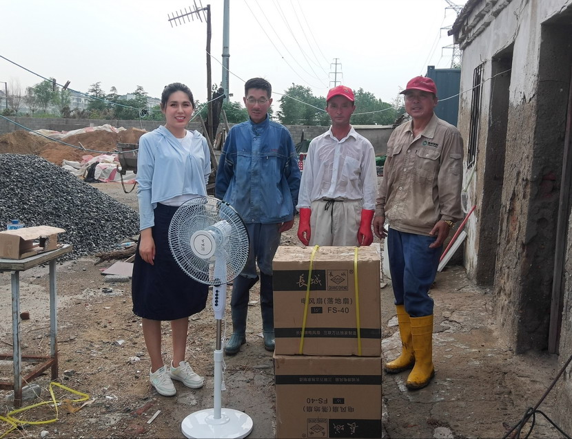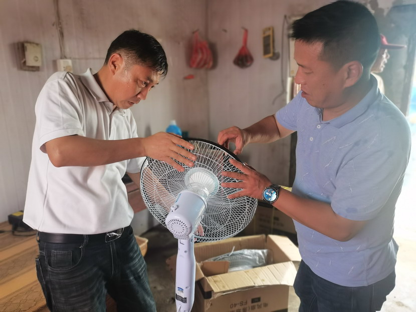 15臺(tái)風(fēng)扇陸續(xù)送至“先鋒、昌圩、大浦”三個(gè)礦鹽班組,公司領(lǐng)導(dǎo)一邊親手為職工進(jìn)行安裝,一邊與他們親切交談,詳細(xì)了解職工需求,充分肯定他們不畏艱辛、吃苦耐勞的奉獻(xiàn)精神,叮囑他們做好防暑措施,保障身心健康,同時(shí)保障生產(chǎn)作業(yè)安全平穩(wěn)。